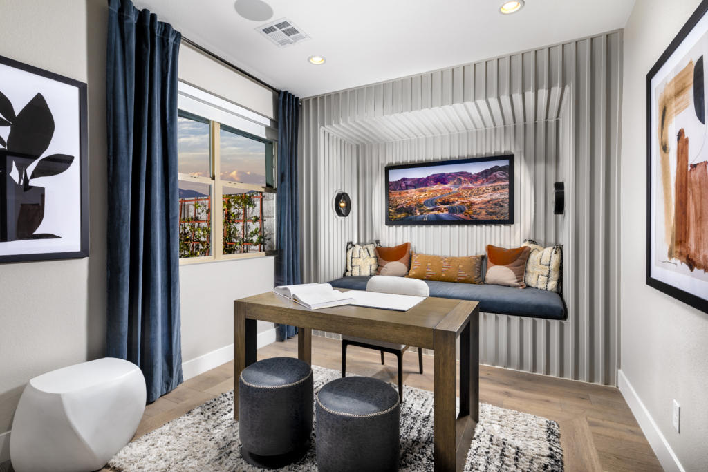 Moving west in Summerlin to the district of Redpoint Square, the three-story Luciana townhome at Cordillera by Toll Brothers embodies a contemporary modern design that features a second-floor great room, creating the quintessential holiday nook and perfect spot for the tree thanks to the home’s 11-foot ceilings. This plan offers 2,019 square feet of living space and four bedrooms, priced from the $600,000s.